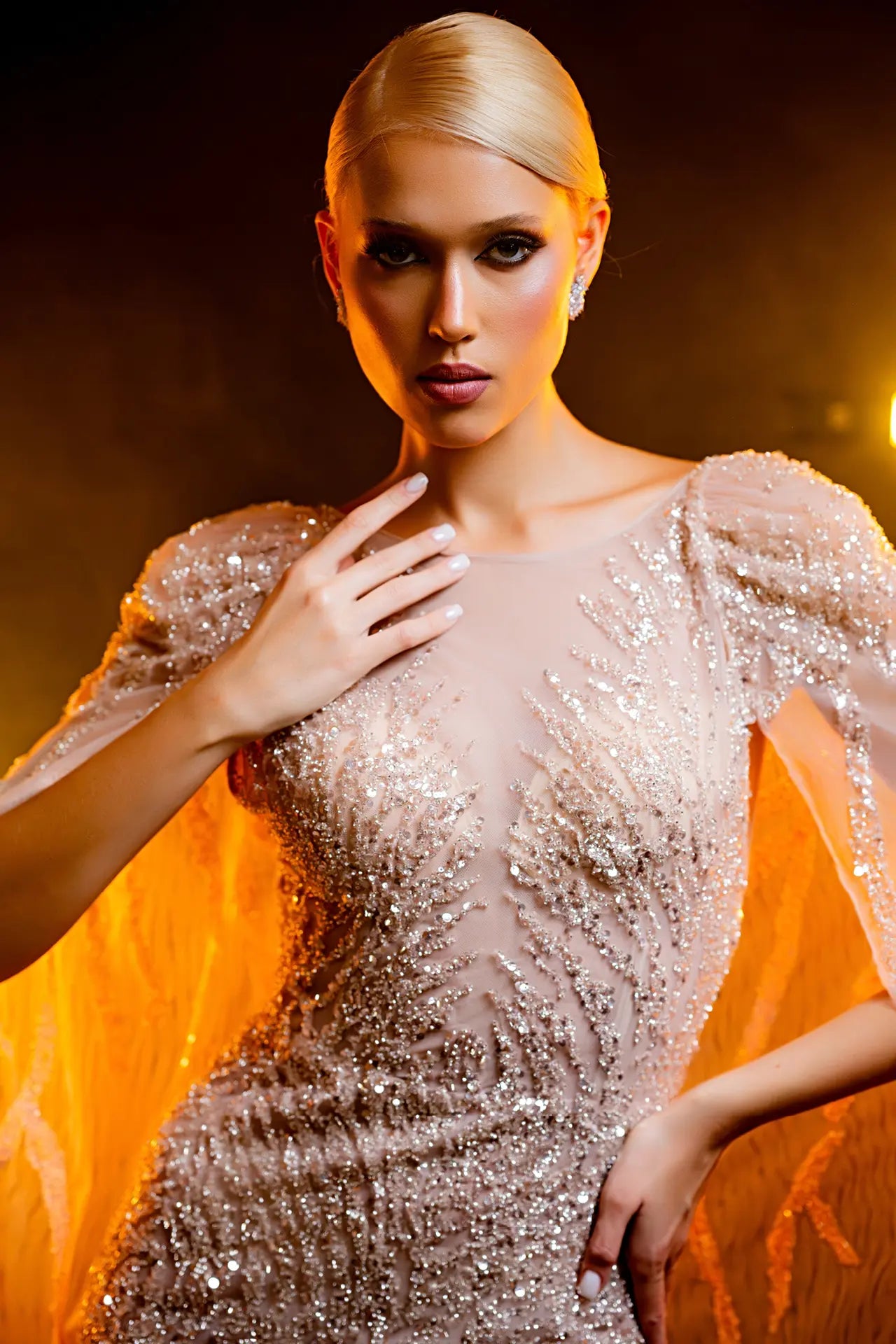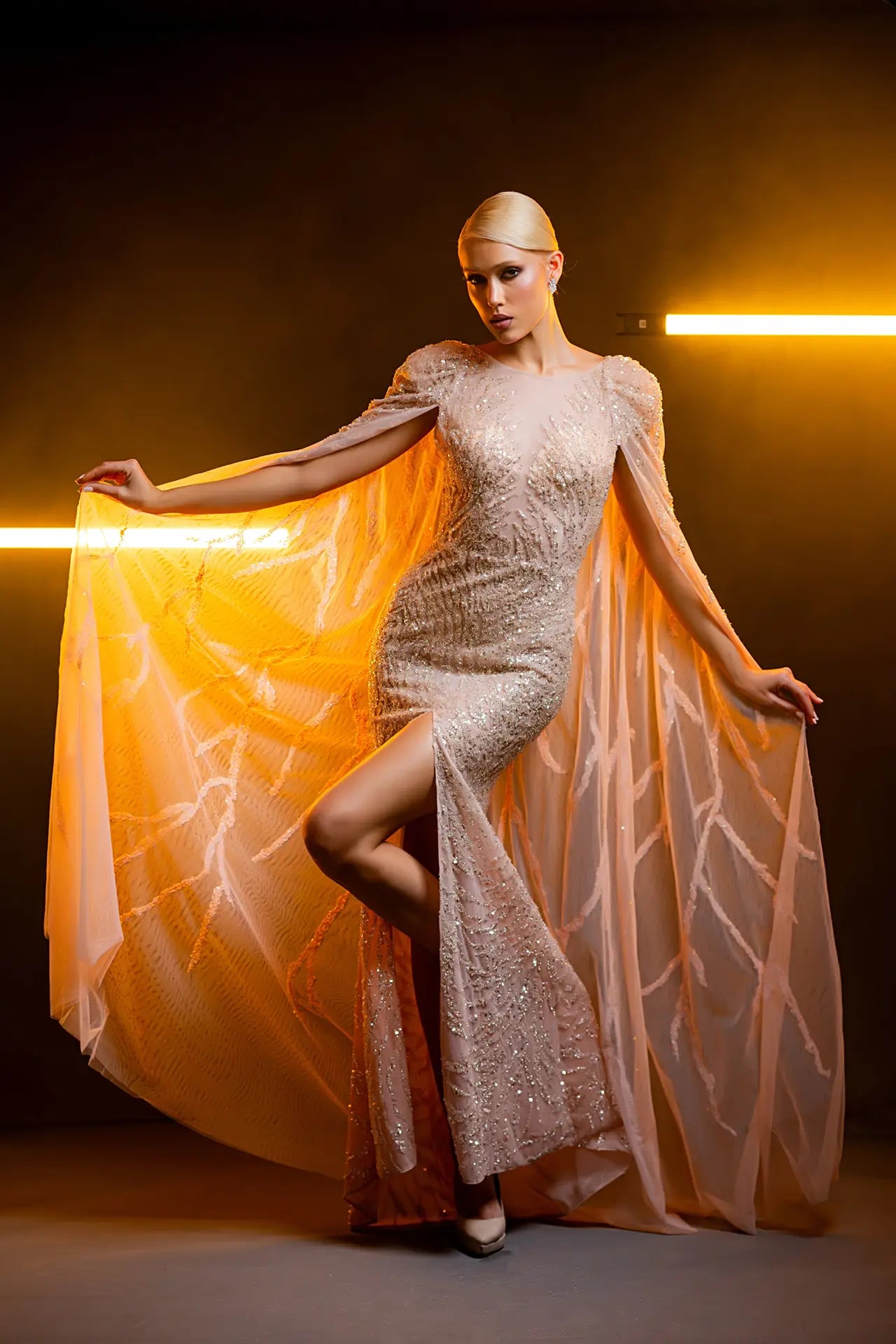 Like constellations adorning the night sky shimmering embellishments cascade gracefully across the gown, while the ethereal cape shoulders below like clouds in the moonlight.