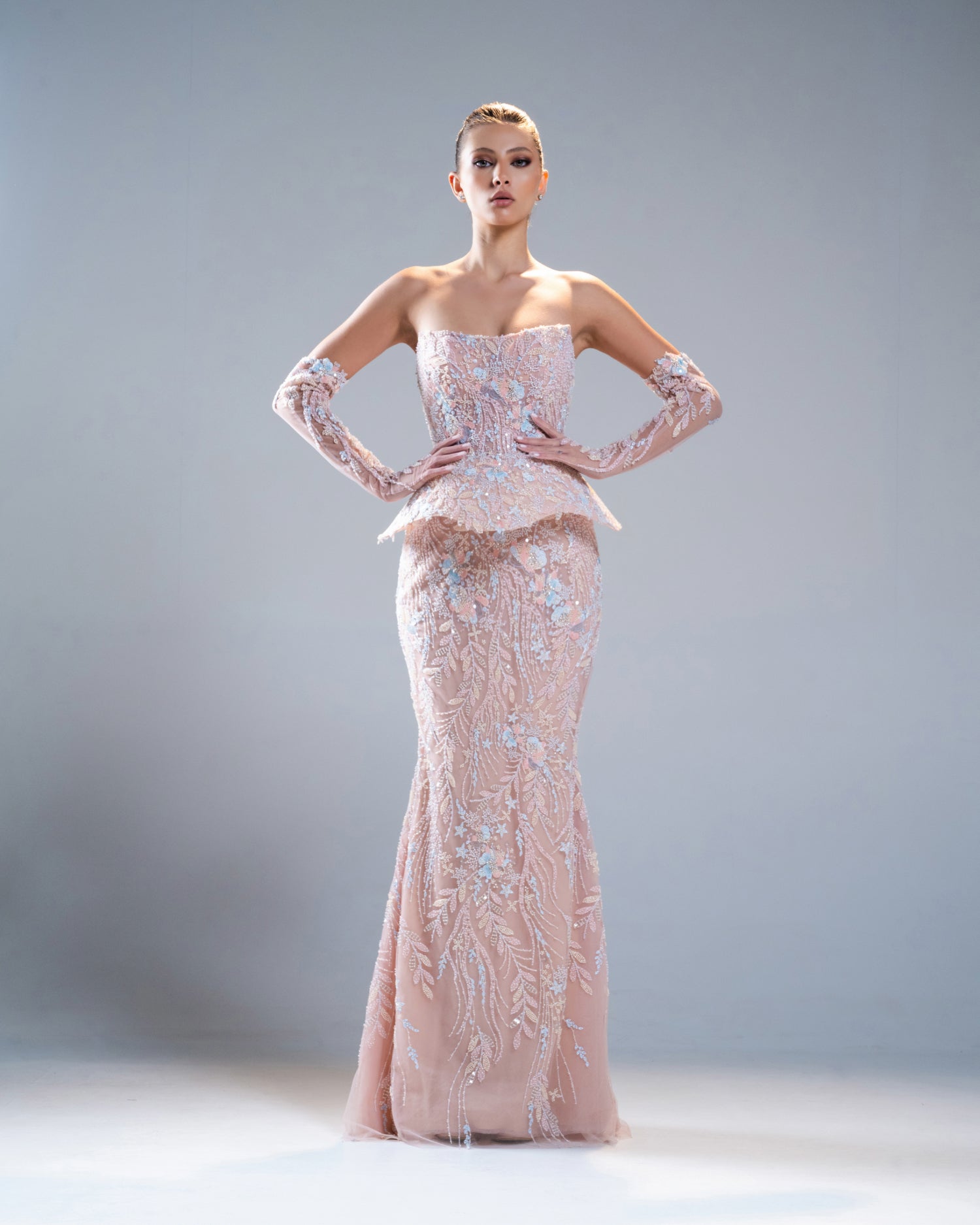 A soft pink masterpiece with shimmering embellishments and elegant gloves, radiating romance for a dreamy evening.