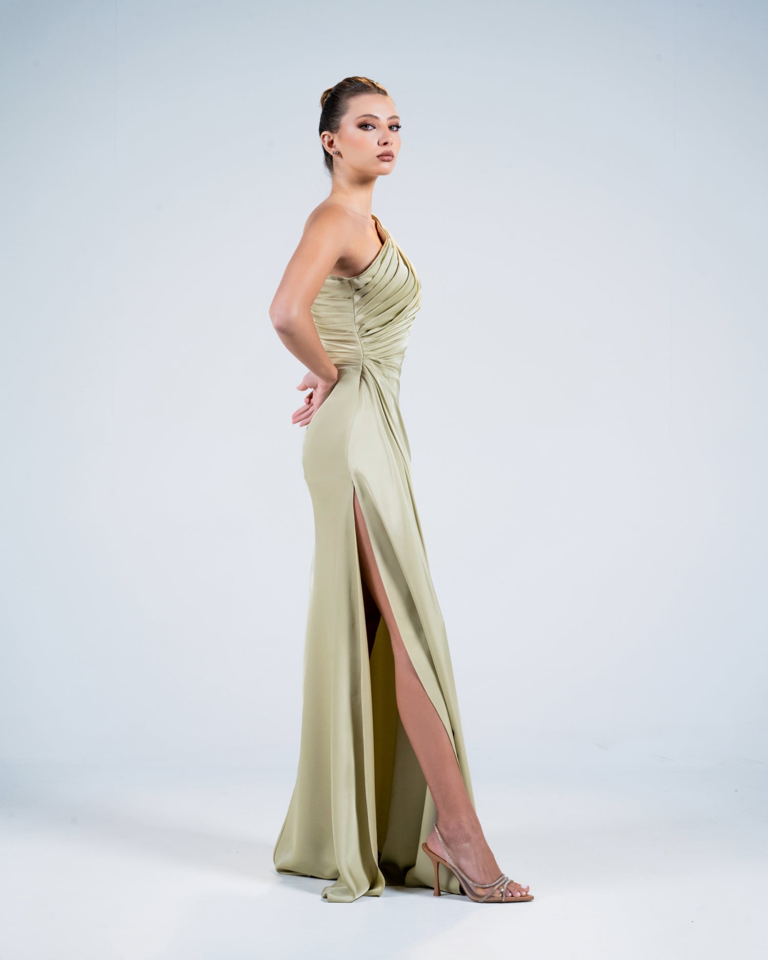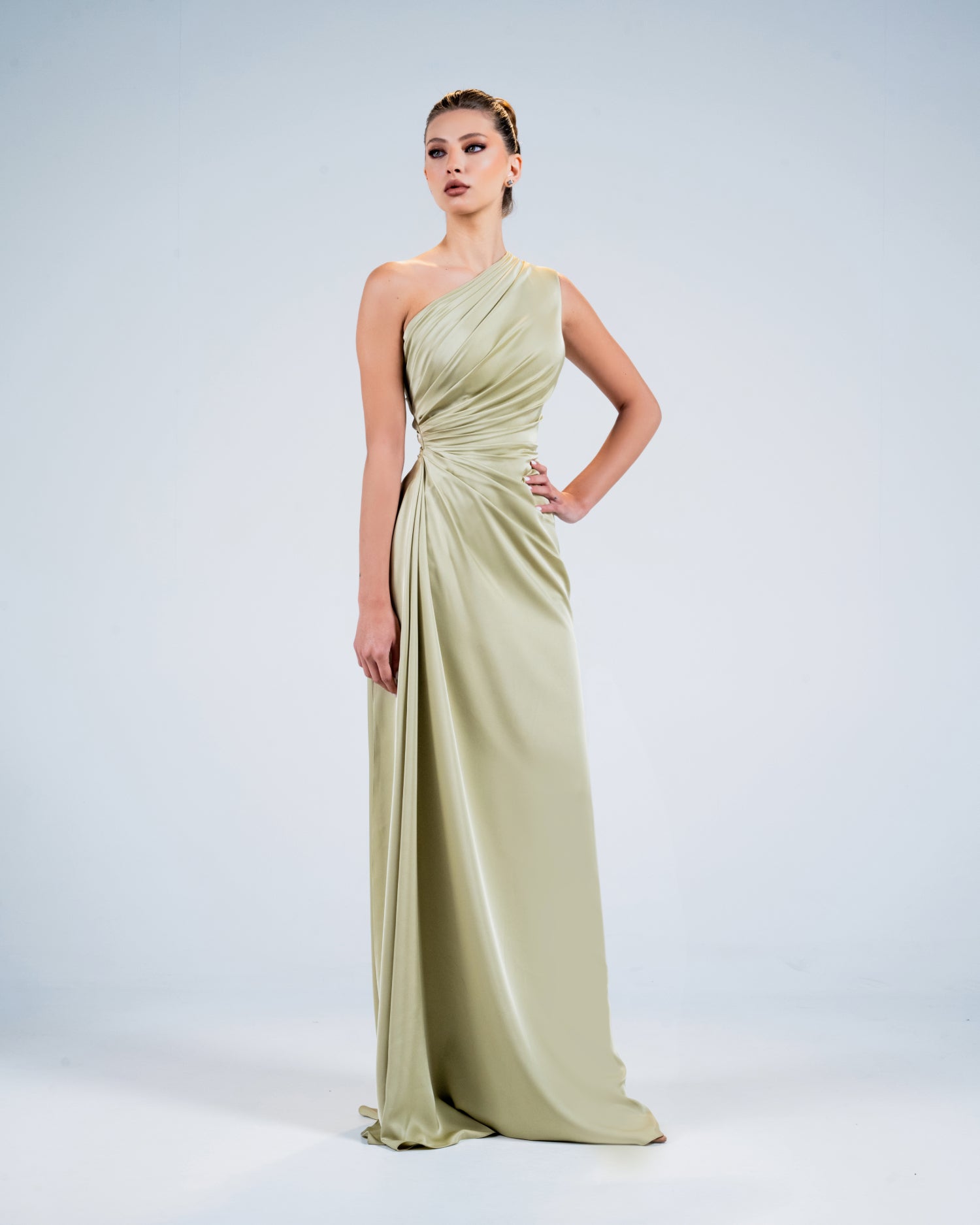Soft draping and a minimalist silhouette define this elegant sage-green gown, embodying understated luxury and effortless sophistication.