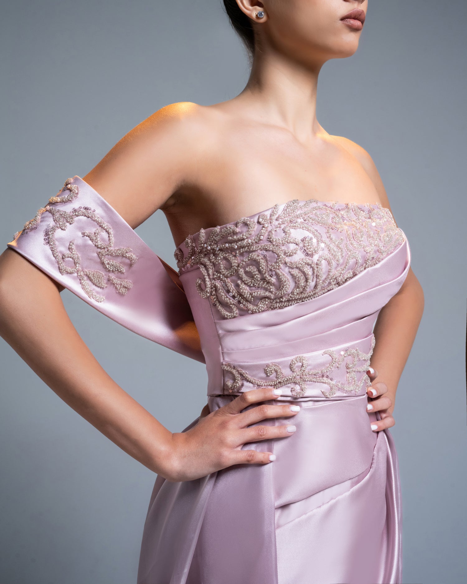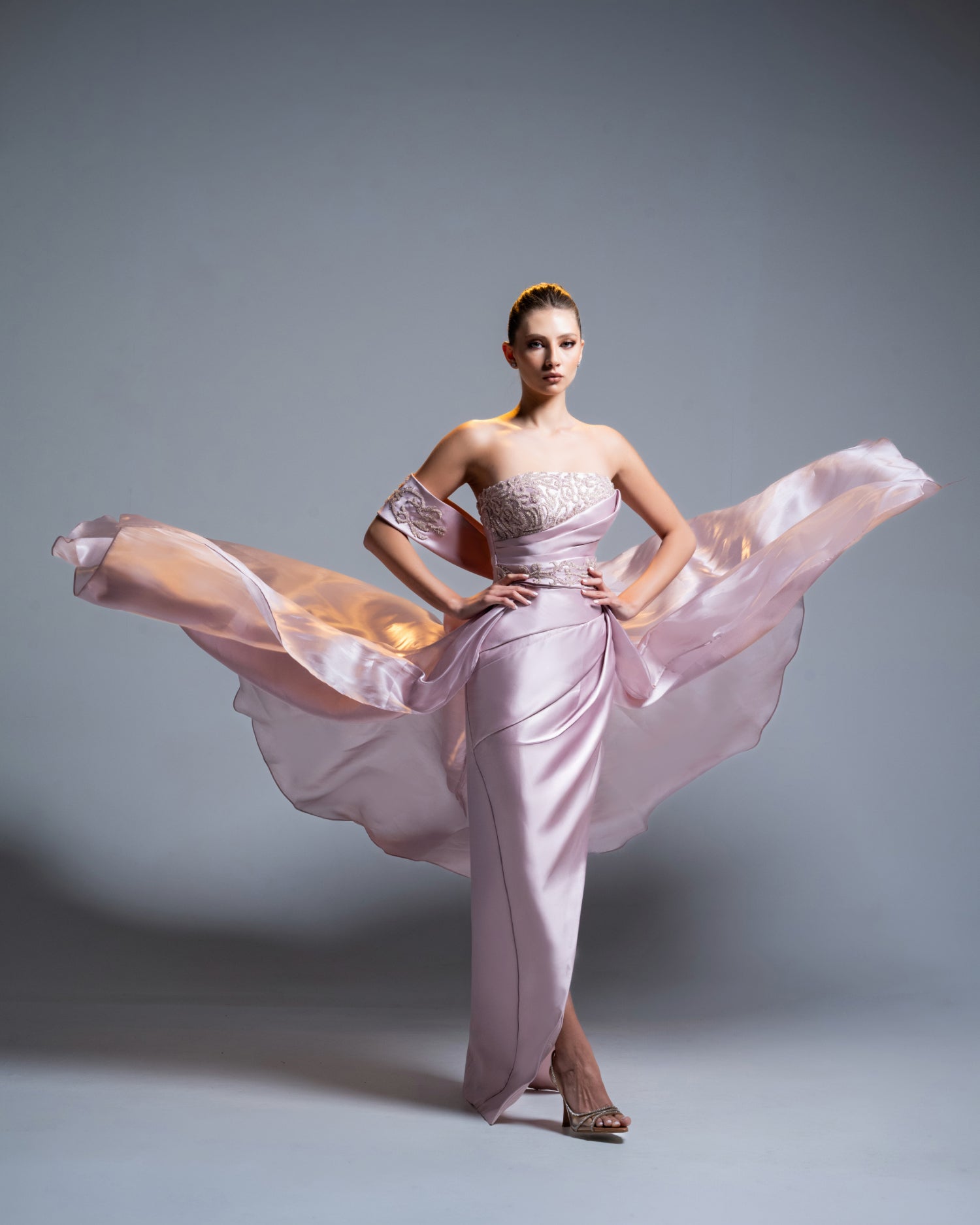 A dramatic pink gown with voluminous layers that create a striking silhouette, perfect for making a grand entrance.