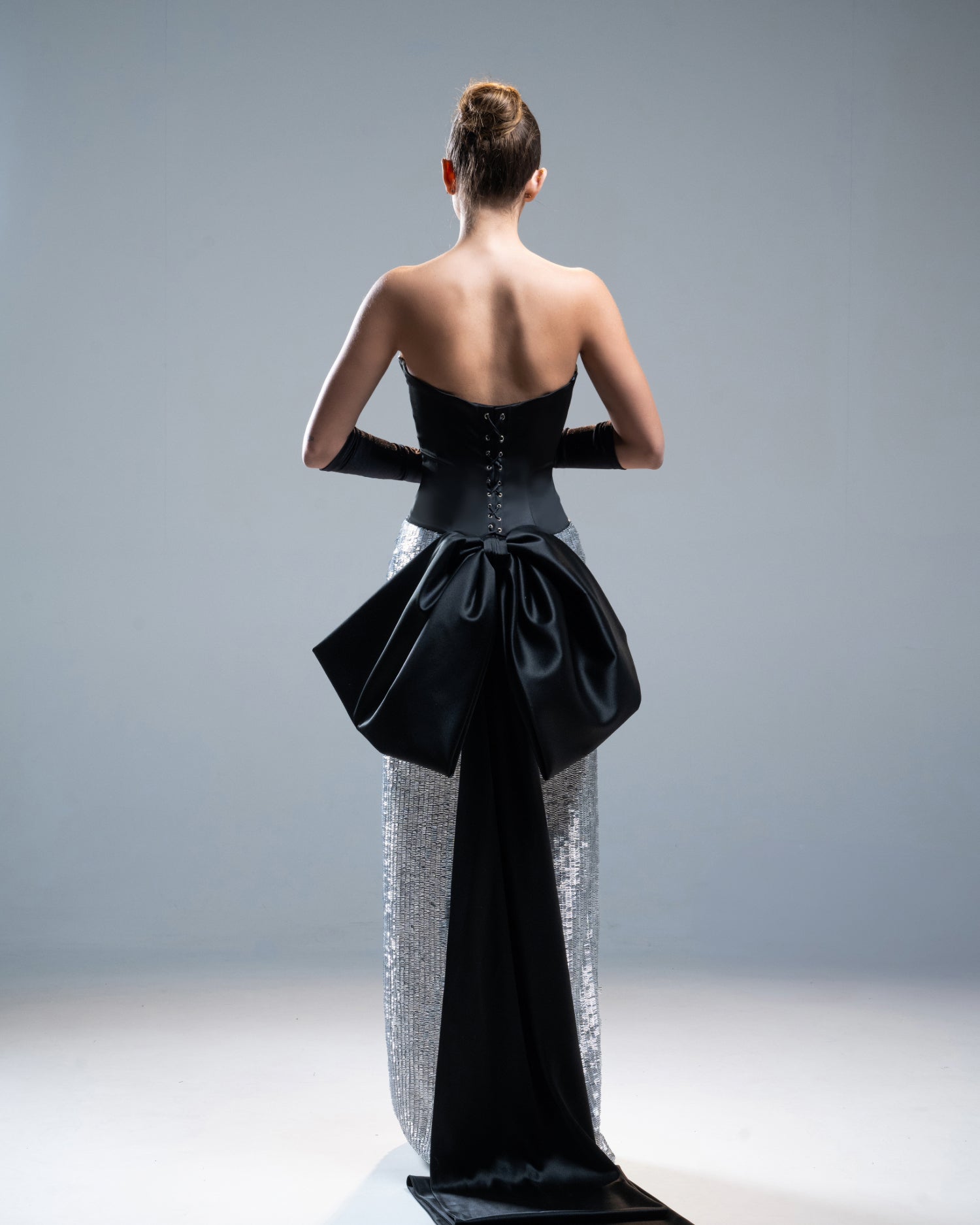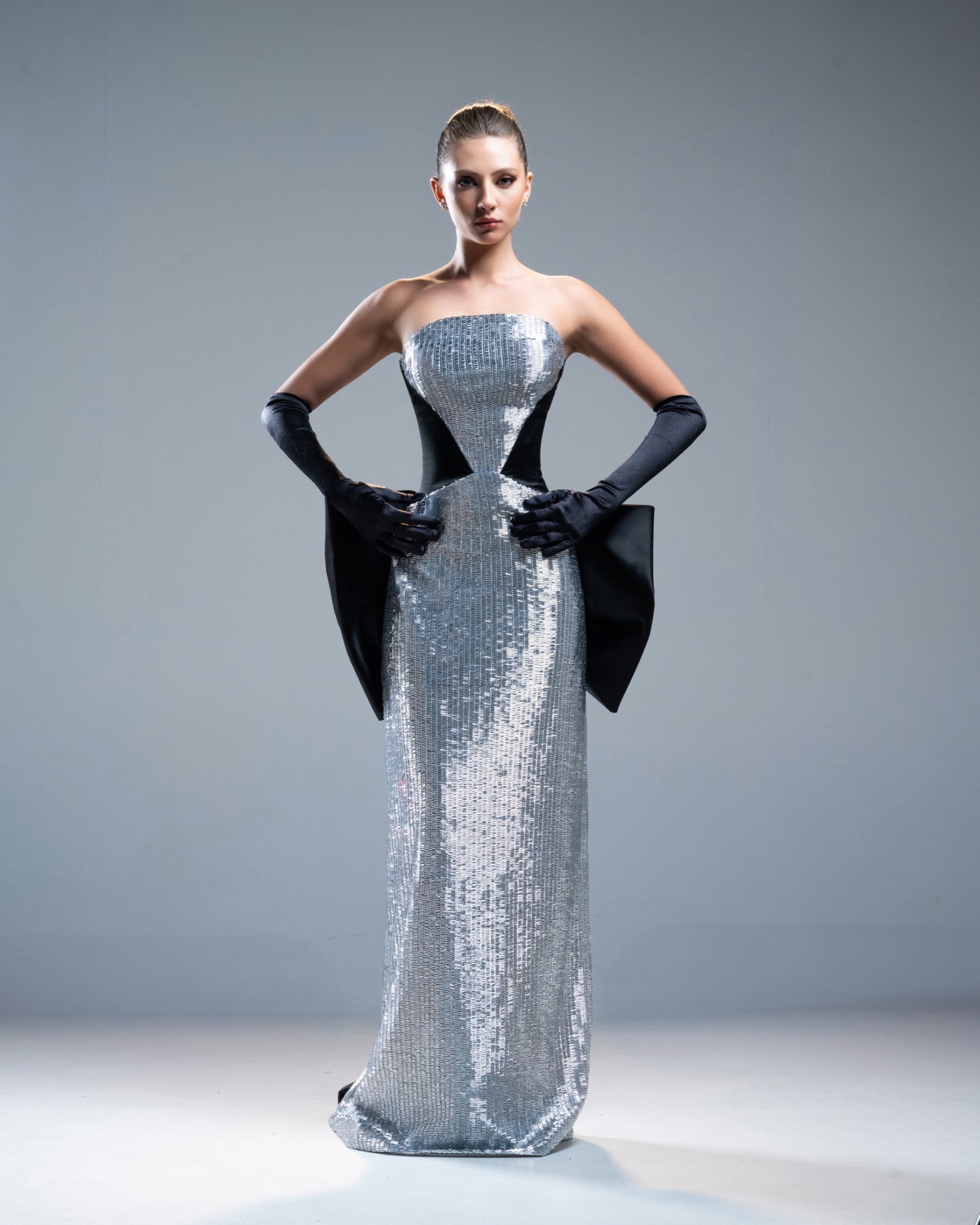 Dazzling in silver sequins, this gown is a showstopper. The structured bodice and dramatic gloves add a bold, futuristic edge.