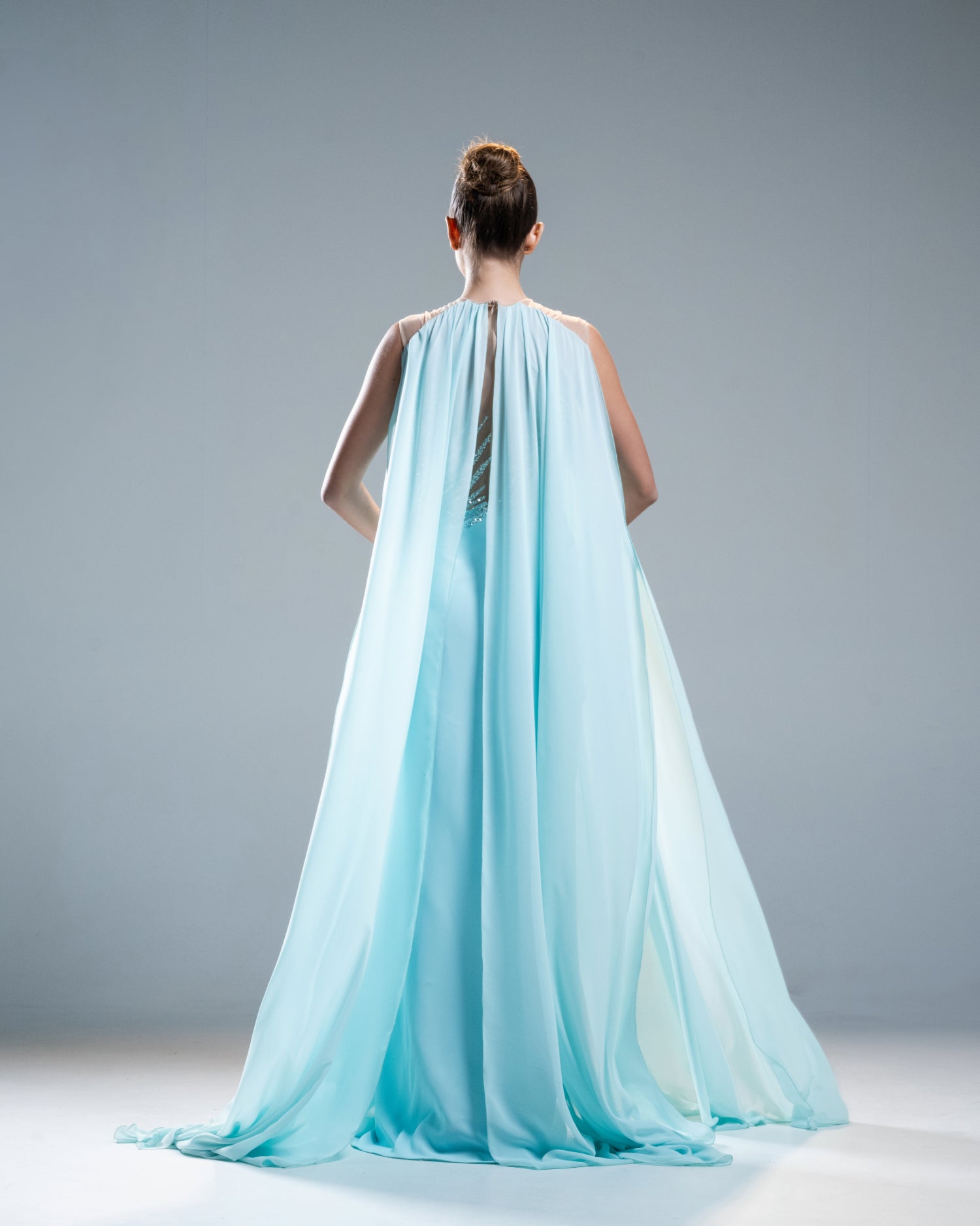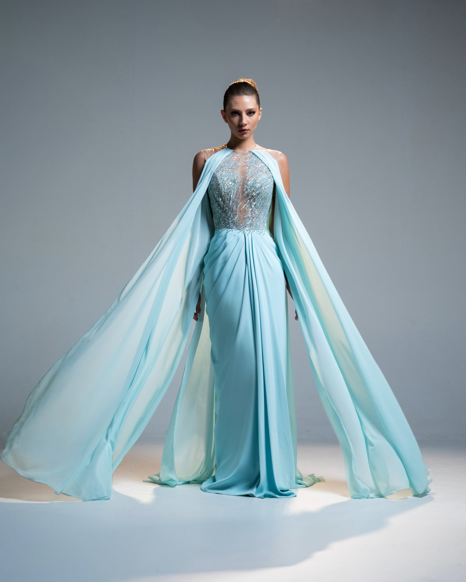 An ethereal sky-blue gown with flowing cape sleeves embodying grace, movement, and an air of divine beauty.