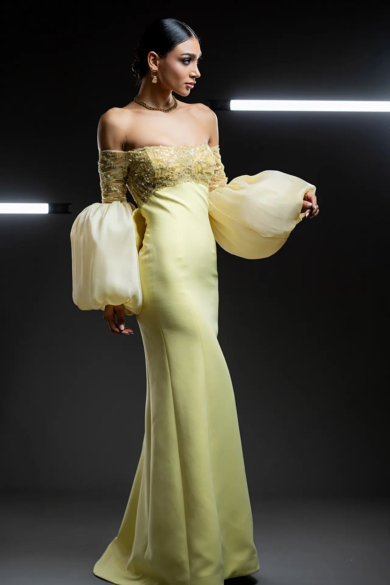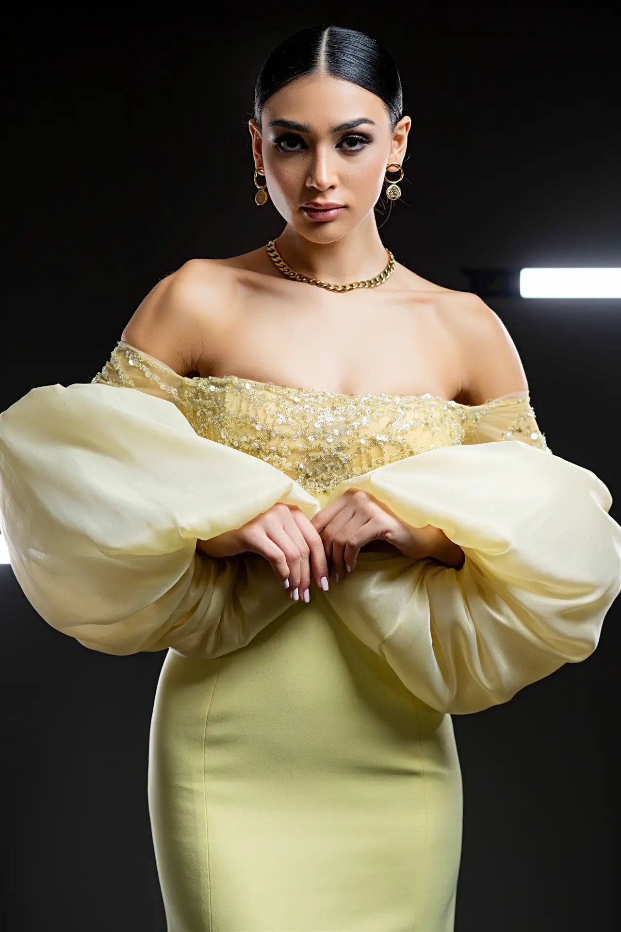 The crepe dress with puffed sleeve chic and versatile garment that effortlessly combines sophistication with touch of whimsy.