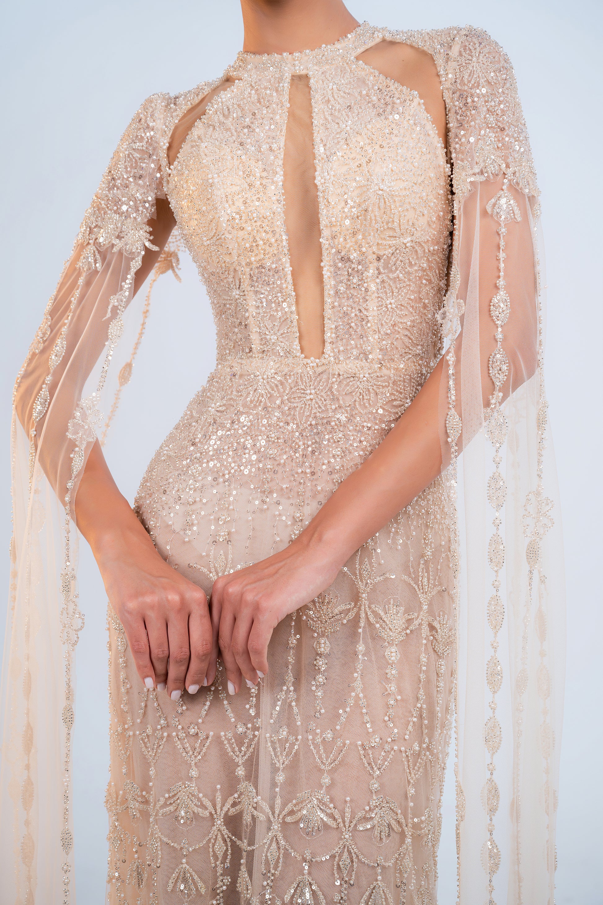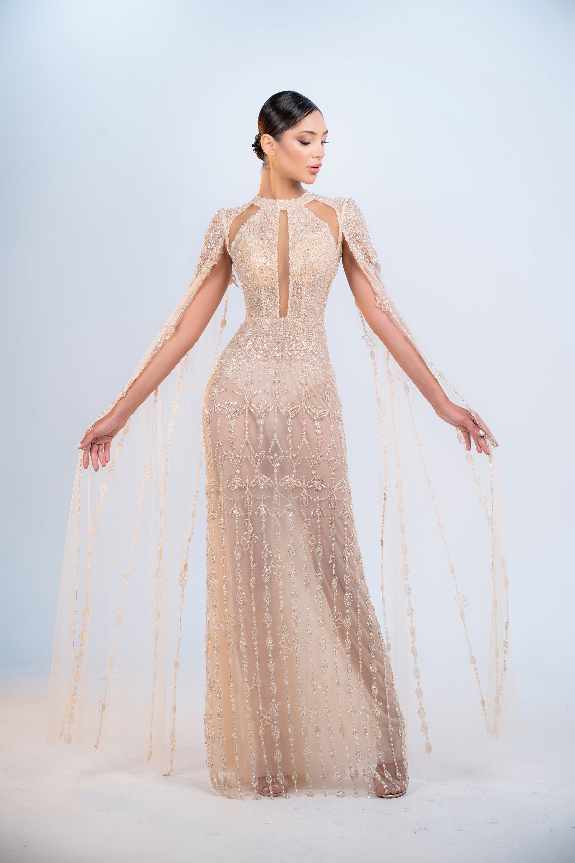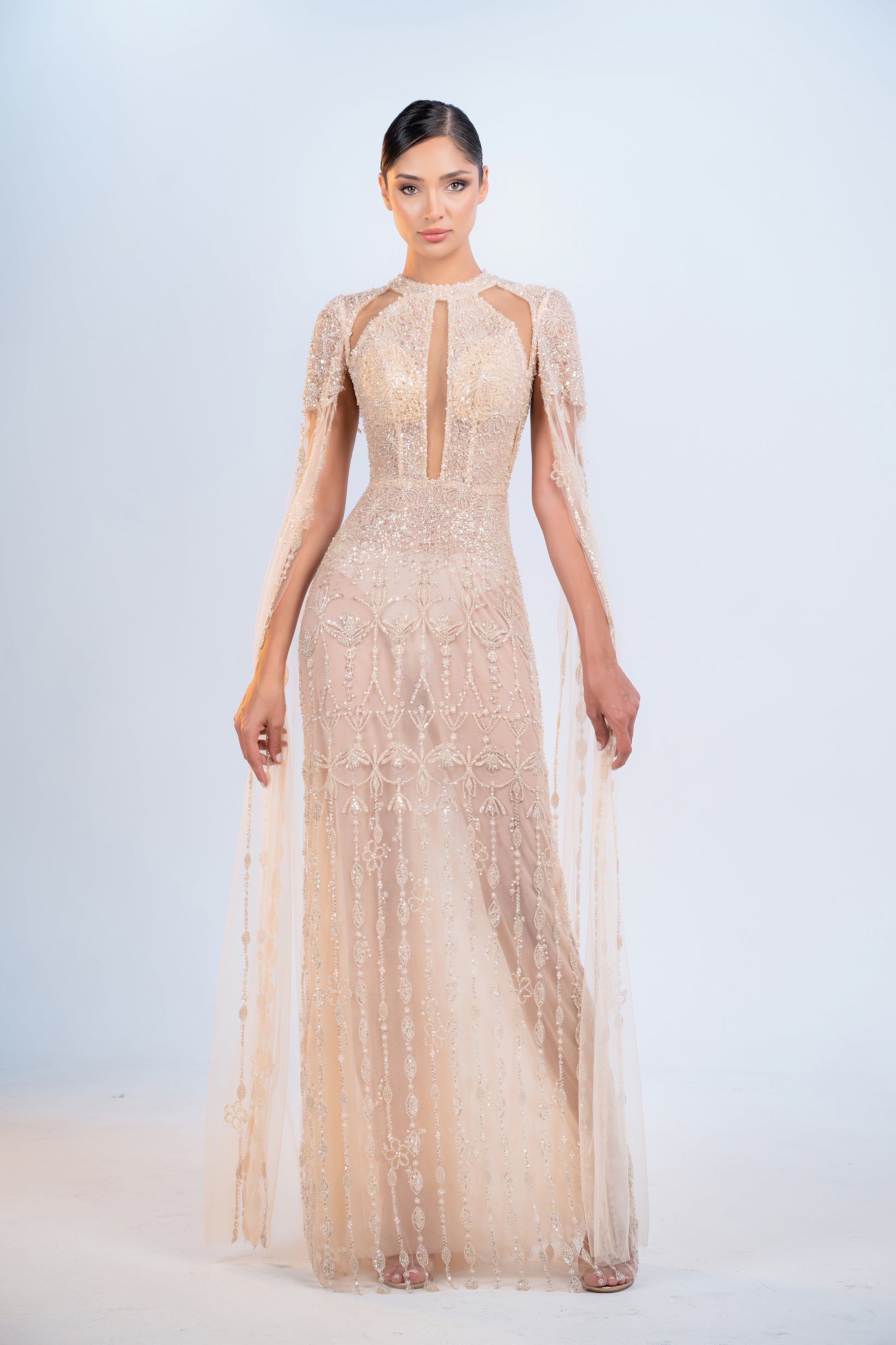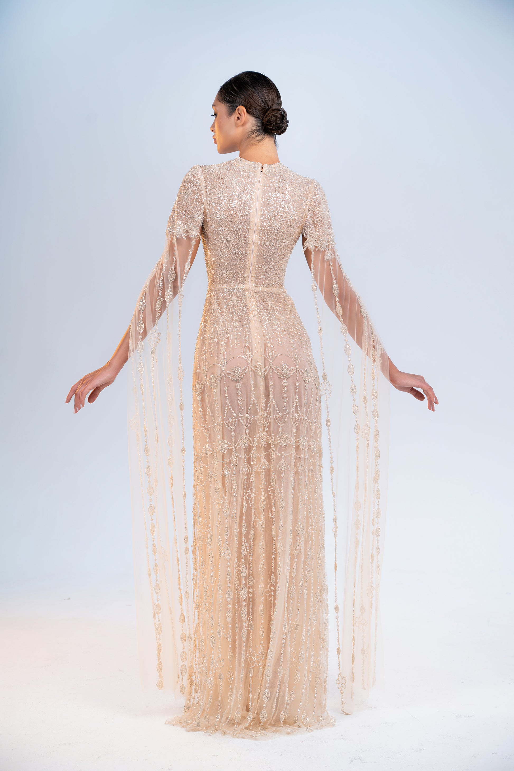 This dress features an all-over beaded design with intricate cut-out details that accentuate its flowing long sleeves, creating a stunning and modern look.