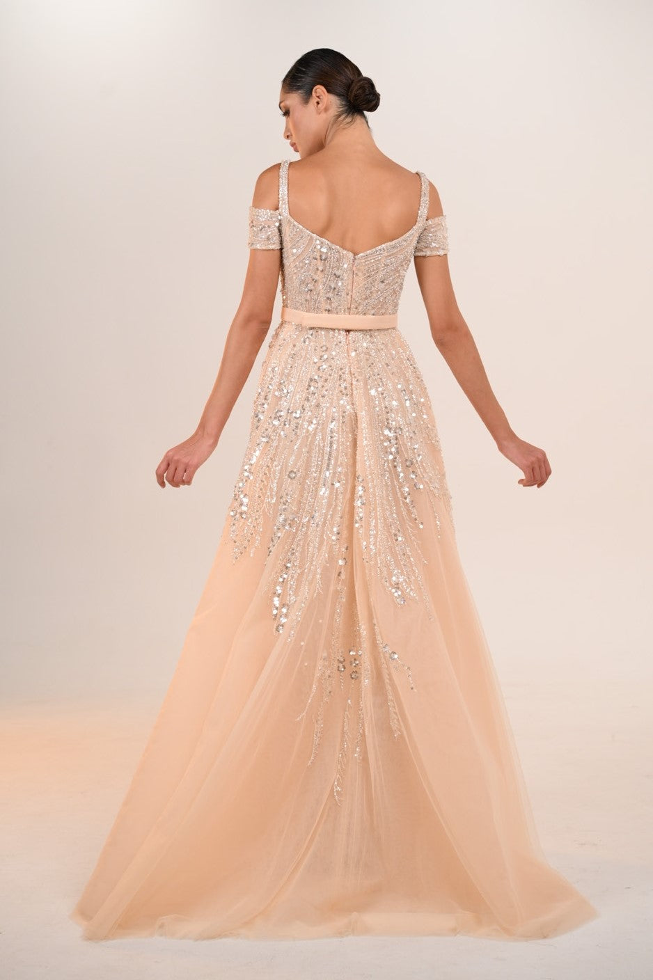 A dazzling sequin dress featuring a stylish belt and a graceful low