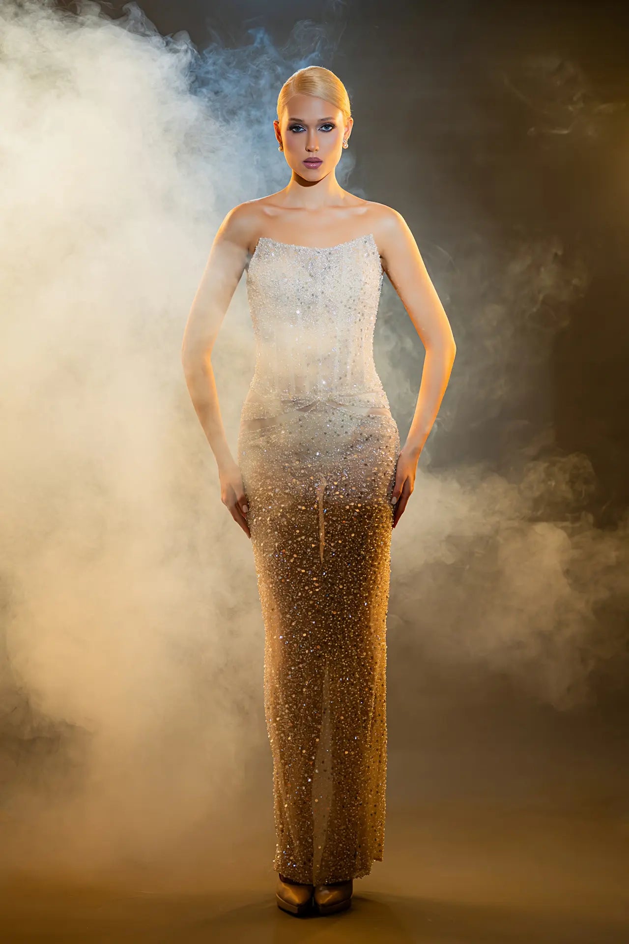 Celebrates the beauty of craftsmanship and the power of intricate detail, adorned with delicate pearls, sparkling crystals, ad intricate sequins.