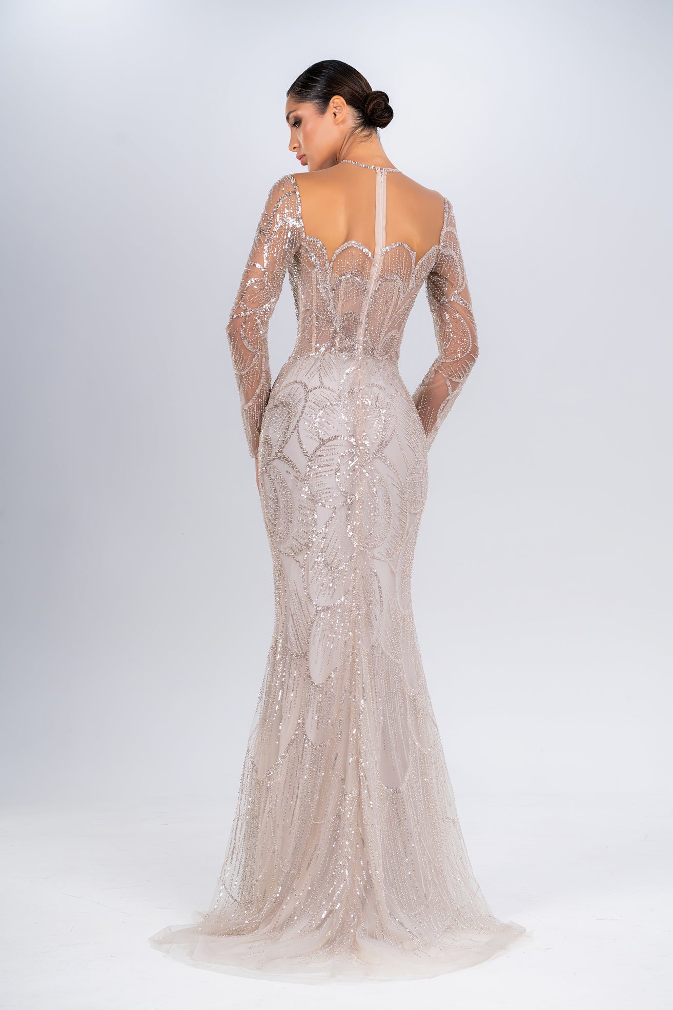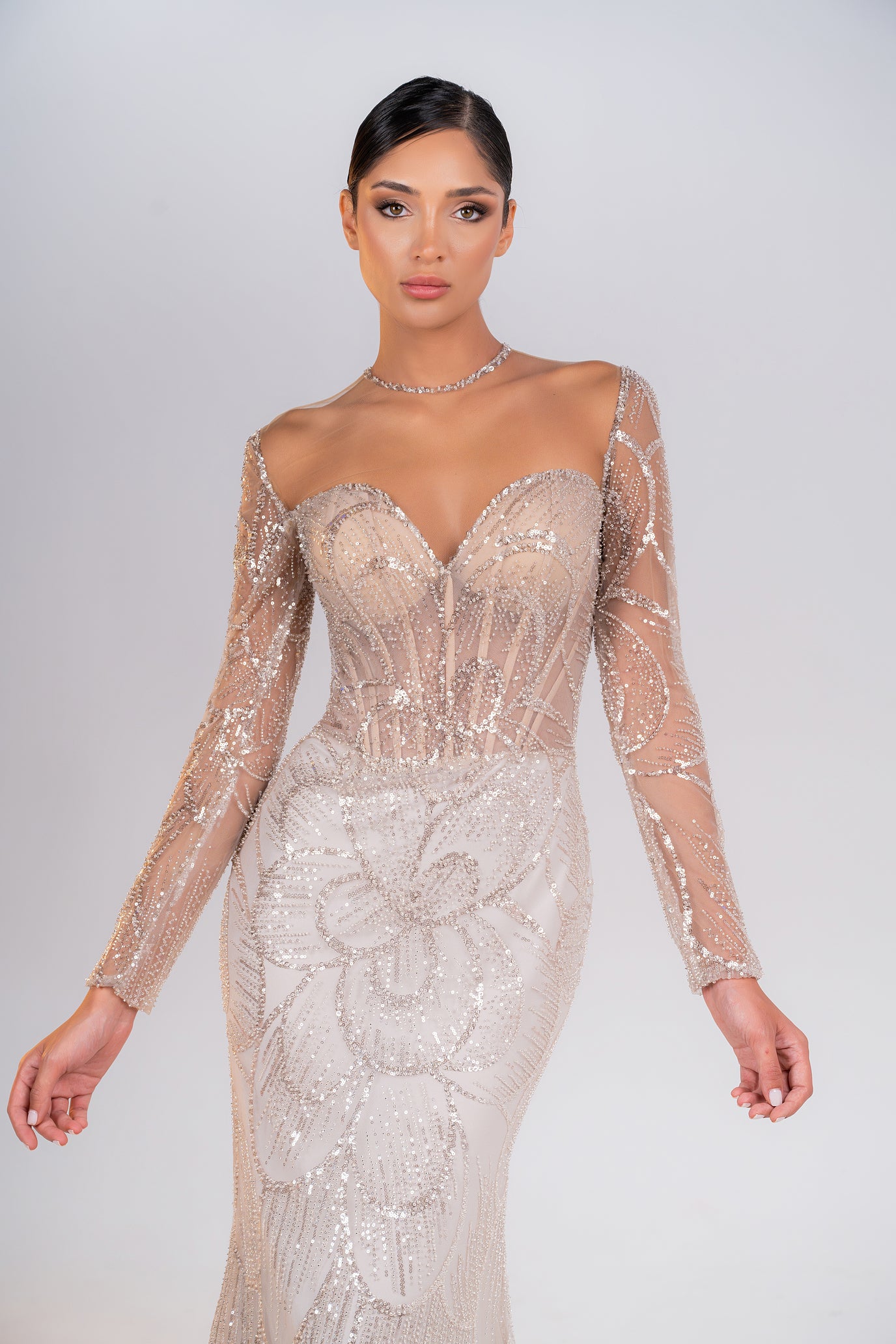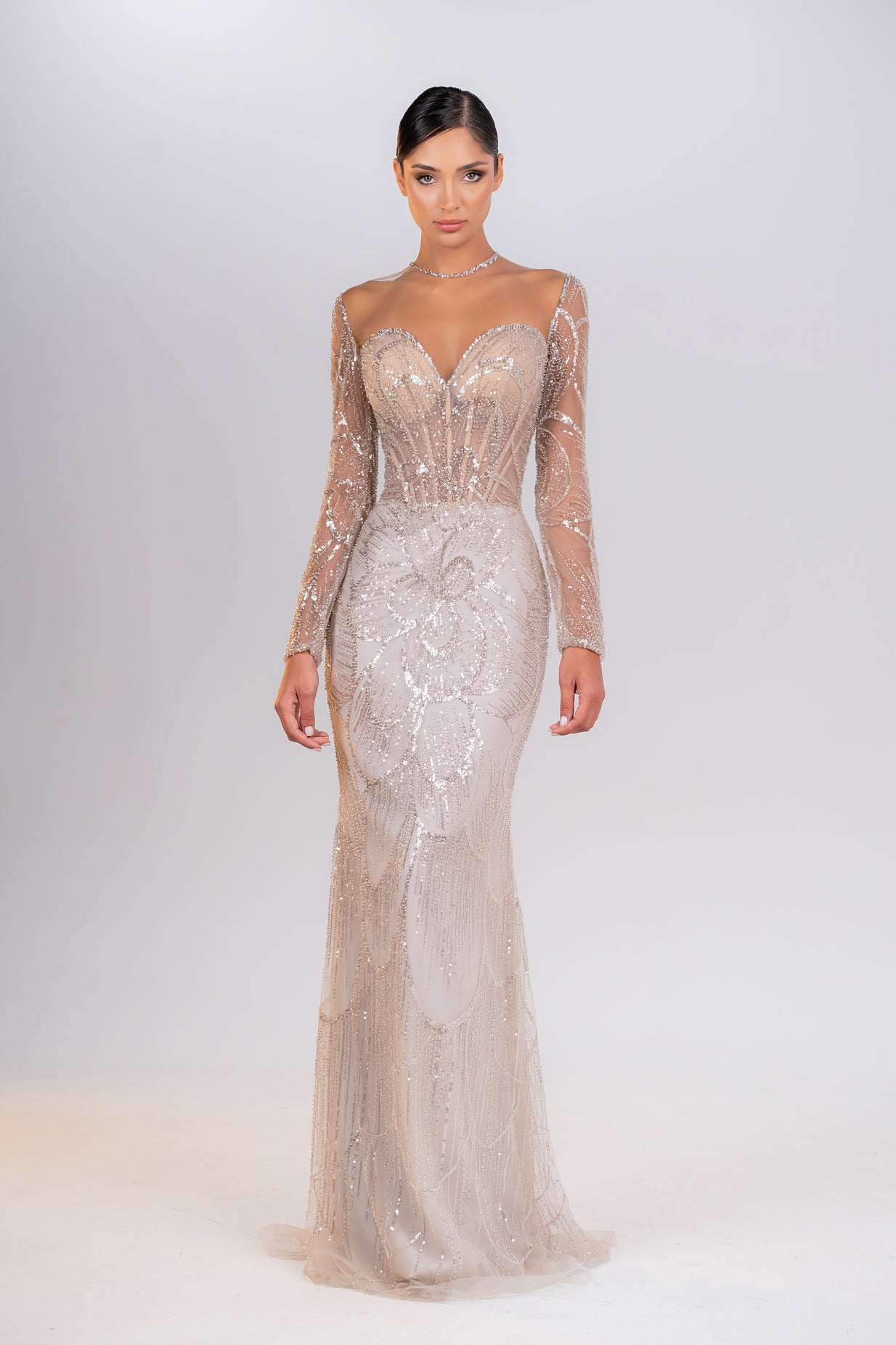 A beautifully beaded dress showcasing a classic sweetheart neckline and elegant long sleeves, blending classic style with modern elegance.